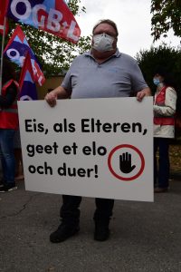 Auch Henri Knuppertz, Präsident der Elternvereinigung des „Kräizbierg“, ist anwesend: „Es geht uns darum, jene zu unterstützen, die heute hier im Interesse der Behinderten anwesend sind.“ Die Elternvereinigung, die bei der Aktion am Donnerstag zwar stark vertreten war, hat sich bislang eher zurückgehalten: „ganz einfach, weil wir bisher nur vom Personal angesprochen wurden, nicht aber von der Direktion. Vor Jahren hatten wir eine ähnliche Situation, da konnten wir vermitteln, weil wir von beiden Seiten um Hilfe gebeten wurden“, so Henri Knuppertz.