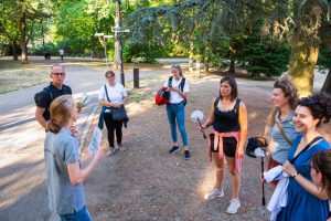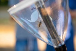 So einige Aussagen der Biologin rufen im weiteren Verlauf des Treffens Erstaunen bei ihren Zuhörerinnen und Zuhörern hervor. Zum Beispiel, dass Ameisen und Wespen eng miteinander verwandt sind. „Das sind quasi Wespen ohne Flügel“, erklärt Lieke Mevis, nachdem sich die Gruppe in der Nähe der Schobermesse zu einem grauen Mülleimer im Stadtpark begeben hat. Denn dort kann die begeisterte Biologin in Ruhe ihr Wissen teilen – und: dank Hilfe der Teilnehmenden eine Biene und eine Wespe einfangen, diese für einen kurzen Moment in durchsichtige, mit Lupen versehene Behälter einschließen, um den Unterschied zu erläutern.