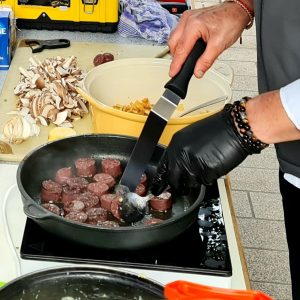 Für die Hauptspeise entschied sich René Kertz für Blutwurst. Auch diese richtete er recht schnell an. Das Geheimnis bestand darin, die frische Blutwurst vor dem Braten in Scheiben zu schneiden. Das Kartoffelpüree verfeinerte er mit Sellerie und Sellerieblättern. Für ein leckeres Topping setzte Kertz auf karamellisierte Äpfel, die er zuvor ebenfalls in kleine Streifen geschnitten hatte.