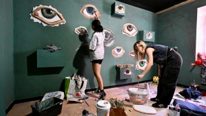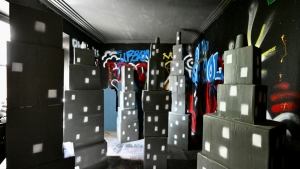 Zum Werk der Primaner gehören Räume, in denen das Auge auf den Besucher gerichtet ist, wo unten oben ist und Hochhäuser eine dunkle Stimmung verbreiten. Detailreiche Mangafiguren zieren die Wände und ganz oben, unter dem Dachboden, ist alles himmelblau. Alles eine Frage der Perspektive.