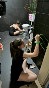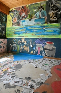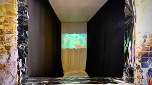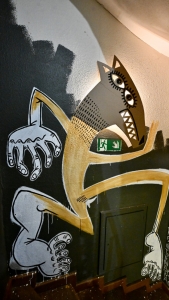 Durch den mit Goldfolie tapezierten Eingangsbereich geht es, entlang der Bar und eines spannenden Trickfilms, durch viele Räume und über viele Stockwerke hinein in eine vielfältige Kunstwelt. Es riecht nach Farbe und nach Rindenmulch. Kurzweilige Eindrücke laden zu tieferen Gedankengängen ein.