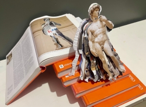 Weiter geht’s durchs Treppenhaus. Hier haben die Kunstlehrer des LGE mit Hand angelegt. Der Blick fällt dann auf ein Buch, aus dem Michelangelos David herausragt. Beim Buch handelt es sich um ein Schulbuch. Vergangenheitsbewältigung könnte man das nennen.