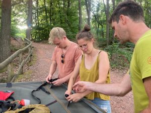 Knoten müssen gesetzt, Strickleitern eingehängt und die Hänger zu ihrem Platz zwischen den Bäumen gebracht werden. Von Liege zu Liege werden – noch mit festem Boden unter den Füßen – Tipps ausgetauscht und erste Geschichten erzählt. Das Feintuning für den Abend ist Gemeinschaftsarbeit. Das ist gewollt. Einander Fremde lernen sich kennen.