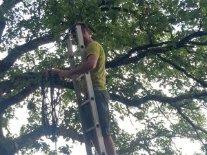 Zwischen den Bäumen, wo der Blick auf das glitzernde Wasser der Saar fällt, sind in zwei Metern Höhe Stahlseile montiert. Dort müssen die Hänger eingehängt werden. Bei Martin Hager sitzt jeder Griff. Routiniert klinkt er sie von der mitgebrachten Leiter ein, befestigt die Seile. Die Cloefhänger erleben dieses Jahr ihre achte Saison. Nur der Grill muss aus bleiben, Brandgefahr. Hager hat das Abendessen mitgebracht, wo es die Teilnehmer an der Bank und dem Tisch später verzehren werden.