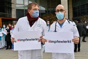 Vor allem eine Botschaft wollen die Teilnehmer mit der Schweigeminute vermitteln. Und die lautet: Die Impfung wirkt! „Ja, auch ein geimpfter Mensch kann sich mit dem Virus infizieren. Doch der Verlauf ist weitaus harmloser. Fakt ist: Die Impfung schützt!“, so Dr. Klop, der nicht alle Impfskeptiker in einen Topf mit Verschwörungstheoretikern werfen möchte: „Manche Menschen haben einfach Angst“, so seine Schlussfolgerung.