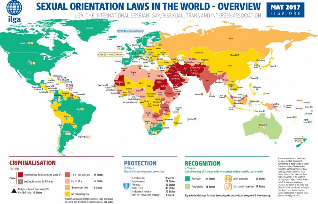 Die folgende Karte gibt eine weltweite Übersicht über die Gesetze zur sexuellen Orientierung. (Stand 2017, Quelle: International Lesbian, Gay, Bisexual, Trans and Intersex Association (ILGA.ORG)):