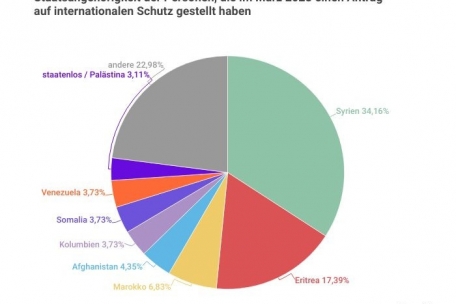 Die relative Mehrheit der Antragsteller kommt aus Syrien (55). Andere Herkunftsländer sind Eritrea (28), Marokko (11), Afghanistan (7), Kolumbien, Somalia und Venezuela (jeweils 6), unbestimmt („Palästina“, 5) sowie andere (37).