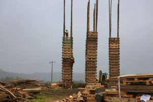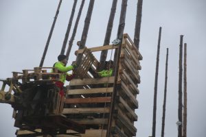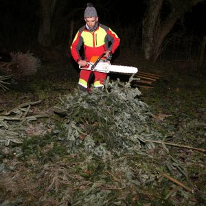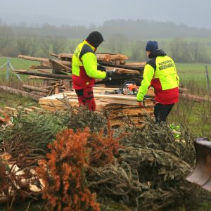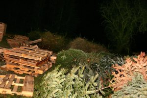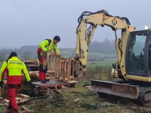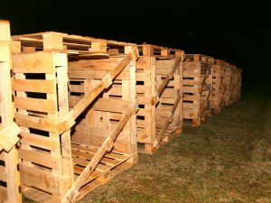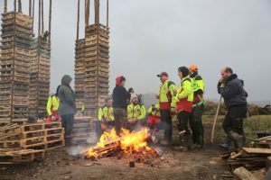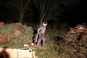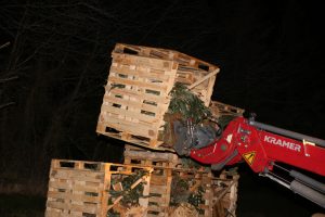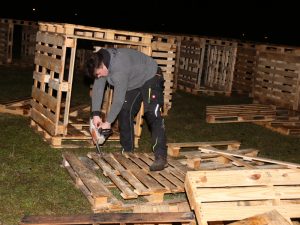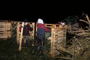 Das Grundgerüst besteht aus 40 mit jeweils vier Paletten geformten Kisten. Unter Scheinwerferlicht und mit jeder Menge Schrauben und Latten fertigen die emsigen Helfer die Kisten an. Am Freitagabend nach Feierabend und erneut unter Scheinwerferlicht geht es weiter: Jeder packt mit an. Während ein Team die ausgedienten Weihnachtsbäume und Paletten mit der Motorsäge kleinschneidet, befüllen andere Helfer die Kisten mit dem leicht brennbaren Material. Anschließend fährt ein Traktor die befüllten Plattenkonstruktionen zur Seite. Erst am kommenden Samstag werden diese dann zur „Buerg“ zusammengebaut.