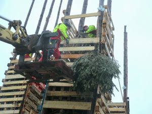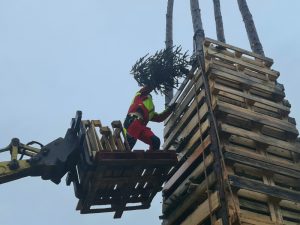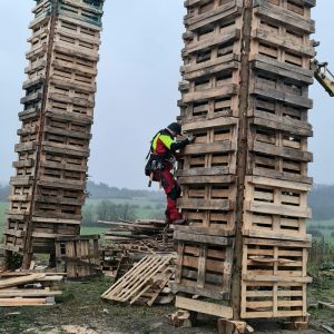 Das Thema Unfallvorsorge nimmt man in Niederanven sehr ernst. Immerhin arbeiten die Helfer in Höhen von bis zu etwa 20 Metern. Demnach sind die Leute mit einer persönlichen Schutzausrüstung, wie sie bei Höhenarbeiten am Seil zum Einsatz kommt, ausgestattet. Das Grundgerüst der Holzkonstruktion sind vier Türme, bestehend aus Fichtenstämmen und Paletten. Diese werden schichtweise mit Weihnachtsbäumen und vorzugsweise Nadelholz befüllt. Anschließend werden die vier Türme mithilfe der Bauhölzer und weiterer Fichtenstämme untereinander verbunden. Dabei entstehen stabile, begehbare „Brücken“, die ihrerseits an eine echte Festungsanlage erinnern.