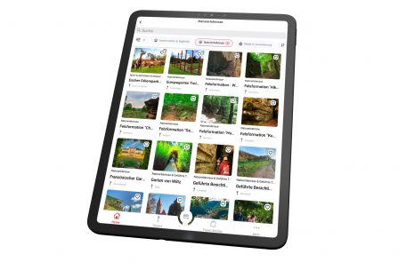 In der unteren Leiste findet der Nutzer Empfehlungen für Touren in der gewünschten Umgebung, die per Suchfunktion eingegeben werden kann. Angezeigt werden beliebte Wanderpfade sowie Rad- und Mountainbike-Touren.