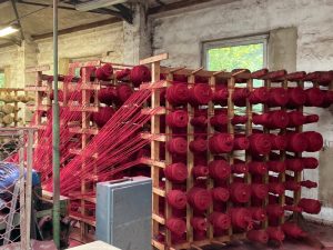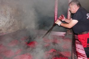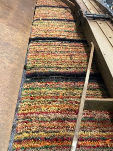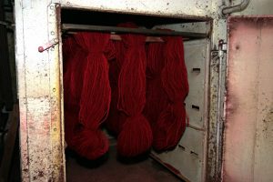 Wenn Not am Mann ist, sitzt Fritzsche schon mal selbst auf dem Gabelstapler, um zu entladen. Rund 300 Tonnen kauft die Weberei pro Jahr. In den Hallen, teilweise Fachwerk, werden die gesponnenen Garne weiterverarbeitet, aus denen dann Teppiche auf den Webstühlen entstehen. Von Natur aus eher bräunlich, ist Kokos schwer zu färben. In der Färberei kocht es 24 Stunden vor sich hin, bis die rote Farbe perfekt ist.