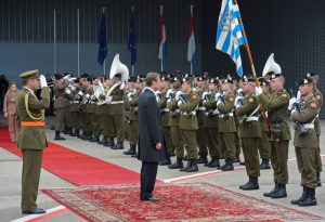 Een rouden Teppëch passt op dëem Bild bei Saldoten ewéi d‘Fauscht op d‘A. Op esou engem Teppech goufen déi aal grieschech Saldoten déi am Krich gewonnen haten ,empfangen an geéiert. Menger Meenung ass daat fir eis Saldoten déi an e verluerenen Krich zéihen an deem mir neicht ze sichen hun , keen gud Omen, oder ? Hoffen mëch ze teuschen.