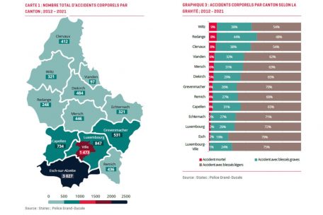Innerhalb Luxemburgs gibt es auch regionale Unterschiede. Im ländlich geprägten Norden kracht es, wenig überraschend, wesentlich seltener als im dicht besiedelten Süden. Spitzenreiter in der Crash-Statistik ist der Kanton Esch. 3.027 Unfälle mit Personenschaden wurden hier in den vergangenen zehn Jahren gezählt. In Luxemburg-Stadt, wo die zweitmeisten dieser Unfälle passierten, waren es weniger als die Hälfte: 1.473. Am anderen Ende der Tabelle stehen die Kantone Vianden (97), Redingen (248) und Wiltz (321).