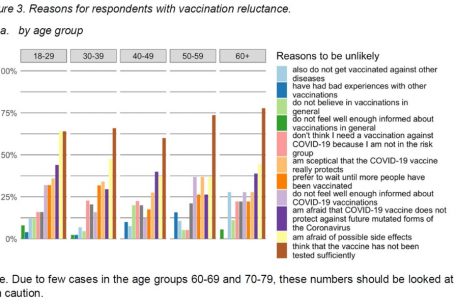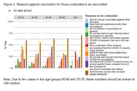 Die größte Rolle spielt aber offenbar das Alter. Bei den über 60-jährigen Ablehnern ist der Hauptgrund mit Abstand ebenfalls die Annahme, dass die Vakzine nicht ausreichend getestet seien. Mehr als 25 Prozent der älteren Impfverweigerer gaben zudem an, sich prinzipiell nicht impfen zu lassen. Den 40- bis 49-jährigen Ablehnern macht zudem Sorgen, dass die derzeitigen Vakzine nicht gegen zukünftige Formen des Coronavirus schützen könnten. Die Angst vor Nebenwirkungen ist bei den 18- bis 29-Jährigen, die die Impfung verweigern, größer als in den anderen Altersgruppen.