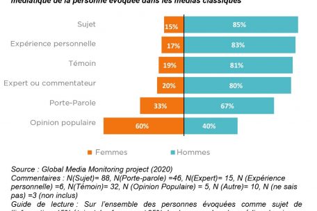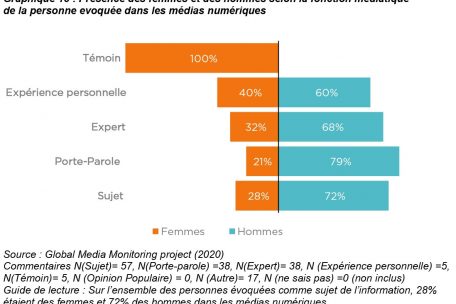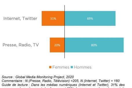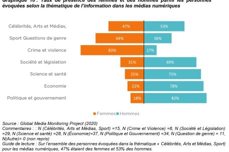 Thematisch findet man Frauen in Medienberichten hauptsächlich in den Themenbereichen „Wissenschaft und Gesundheit“, „Gesellschaft und Legislatur“ sowie „Berühmtheiten, Kunst, Medien und Sport“ wieder. Im Internet sind Frauen auch viel in den Bereichen „Kriminalität und Gewalt“, „Genderfragen“ und „Berühmtheiten, Kunst, Medien und Sport“ zu finden. Besonders in den „prestigeträchtigeren“ Feldern „Politik“ und „Wirtschaft“ kommen Frauen in den Medien deutlich weniger oft zum Zug als Männer. Auch bei den Online-Medien sind Männer häufiger als Experte, Pressesprecher oder Hauptthema zu hören als Frauen.