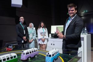 Am Stand von Sébastien Faye ziehen an diesem Morgen vier bunte Nachbildungen von VW-Bussen die Aufmerksamkeit der Vorbeigehenden in dem abgedunkelten Raum auf dem Tech Day auf sich. Dank Tablet werden die kleinen Fahrzeuge ferngesteuert fortbewegt. „Diese bewegen sich dann sofort in die vorgegebene Richtung – ohne zeitliche Verzögerung. Über die 5G-Verbindung hier in Belval ist das möglich“, erklärt Sébastien Faye und fährt fort: „Bei einer Nutzung von 4G kommt es zu Verzögerungen und dadurch zu Unfällen.“ Auf spielerische Art und Weise sollen so die Vorteile von 5G demonstriert werden.