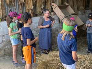 Angela Bissen (49), eine der derzeit drei Animateurinnen oder „Guides“ des Museums, erklärt den Kindern im Hof, wo das vor ihnen liegende Getreide herkommt, wie es verarbeitet wird und wie man Teig daraus herstellt. Vor allem Roggen ist im „Eislek“ die Getreideart, die dort schon immer angebaut wurde – besonders vor hundert Jahren. Beim Dreschen, um die Körner aus den Ähren zu gewinnen, müssen die Kids selbst anpacken.