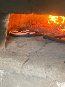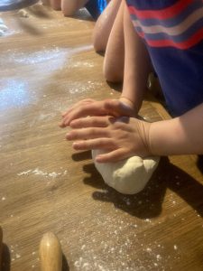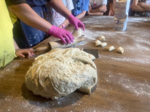Danach geht es in die Backstube, wo der große, in die Wand eingelassene Ofen schon angeheizt ist – wie früher mit gesammeltem Reisig zum Anfachen des Feuers und Holz. Eine Minipizza oder ein großes Stück Brot oder doch beides? – das ist anschließend die Frage. Angela hat Teig vorbereitet und Teigroller liegen auf dem großen Tisch neben der Backstube bereit. Die Kinder entscheiden sich. Die, die kneten wollen, stürzen sich auf das bereitgelegte Stück Teig. Die, die lieber mit der Teigrolle arbeiten, rollen einen Pizzateig aus.
