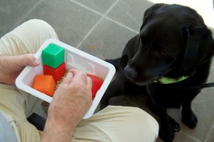 In einem Raum nebenan wartet auf einer blauen Liege bereits Felix Kettels. Die Aussicht auf ein kurzes Training stößt bei ihm im ersten Moment nicht auf allzu große Begeisterung. Doch er weiß: wenn er Miss ein Leckerli geben will, muss er mit der rechten Hand danach greifen und sich dann etwas strecken, um dieses links auf den äußeren Rand der Liege zu legen – sodass Miss es mit der Schnauze erreichen und essen kann. Und so rotiert der Senior seinen Oberkörper in verschiedene Richtungen und trainiert dabei auf spielerische Art und Weise seinen Gleichgewichtssinn. Dabei kommt Freude auf: „Du bist ein guter Hund. Ich nehme dich mit nach Hause“, sagt der Senior, der im Kontakt mit dem Tier sichtlich aufblüht. Auch er hatte früher Hunde.