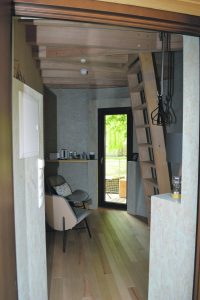 Doch damit nicht genug: Architekt Romain Hoffmann hatte zusätzlich drei „MushRooms“ neben dem erwähnten Pavillon eingeplant, die nun auch stehen. Dabei handelt es sich um wie Pilze aussehende kleine Ferienwohnungen für zwei Personen. Im Erdgeschoss gibt es einen Aufenthaltsraum, durch eine Öffnung in der Wand geht es ins benachbarte Badezimmer. Zum Schlafen steigt man über eine Leiter in die Kuppel, wo ein großes Doppelbett auf die Gäste wartet.