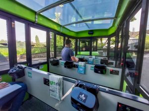 An diesem Wochentag im Mai bleibt Johannes Berdin – neben den beiden Testerinnen aus der Redaktion des Tageblatt – der einzige Gast für die Fahrt um 11 Uhr. Platz ist im ersten Wagon mit den kabellosen VR-Brillen für 15 Personen. Gerade am langen Wochenende nach der Einweihung am vergangenen Freitag haben laut Berdin allerdings viele Menschen die VR ausprobiert. Tickets dafür bekommt man online oder an der Verkaufsstelle, nur wenige Meter vom Startpunkt der Tour mit dem „Pétrusse Express“ entfernt. Insgesamt 29,50 Euro kostet das für eine Person – ein Ausflug zu zweit macht sich demnach mit knapp 60 Euro durchaus in der Brieftasche bemerkbar.