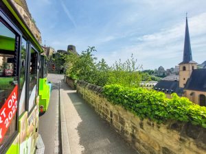 Dafür bekommt man circa 60 Minuten Fahrt, auf der man während der letzten 15 Minuten die VR-Brille trägt. Zuerst aber führt die Tour – immer mit Blick auf die beeindruckende Kulisse der Hauptstadt – vom Startpunkt bei den Kasematten aus auf holperigem Weg über Pflastersteine zum Gelände des Altenheims „Op der Rhum“. Entlang der Abtei Neumünster geht es danach weiter in gemächlichem Tempo durch den Grund und anschließend hoch in Richtung Oberstadt. Über die kostenlosen Kopfhörer kann man sich in sieben Sprachen Informationen zur Geschichte des Großherzogtums, der Kasematten oder der Roten Brücke anhören.