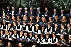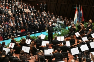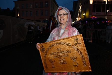 Mittendrin im Fackelzug waren auch Vertreter der portugiesischen Gemeinschaft. Für das großherzogliche Paar hatten sie eine besondere Botschaft dabei. Am Knuedler, vor der Ehrentribüne, dankten sie dem Land für die Aufnahme der portugiesischen Einwanderer auf symbolträchtige Art: Sie hissten die Luxemburger Landesflagge, die mit den Worten „Merci, Lëtzebuerg“ verziert waren. Während sich Regenwolken über der Hauptstadt ergossen, ließ sich niemand die Laune verderben. Im Gegenteil: vor der Ehrentribüne führten Marching Bands ihre choreografischen Darbietungen vor. Der Chor „Lidderuucht“, bekleidet mit historischer Kleidung aus der Belle Epoque, verschönerte den Abend mit einer Aufführung der „Hechtercher aus der Stâdt”.