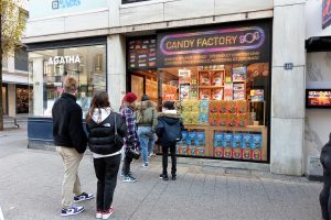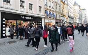 Vor einigen Geschäften bildeten sich gar lange Warteschlangen, darunter hauptsächlich vor Konfektionshäusern sowie Läden, die Luxus- und Kosmetikartikel vertreiben. Etliche andere waren menschenleer. Erfreut über die vielen Besucher dürfte beispielsweise die Kaffeerösterei in der „Groussgaass“ gewesen sein. Da es sich hierbei jedoch um einen recht kleinen Laden handelt, braucht es vergleichsweise wenig Kunden zur Bildung einer Warteschlange.