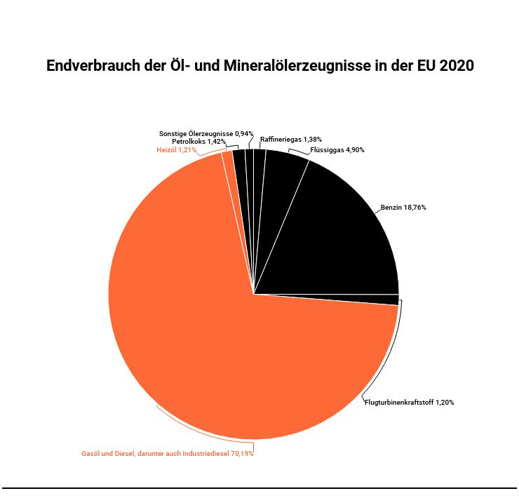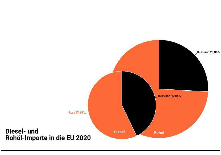 Im Corona-Jahr 2020 wurden 41.762.866 Tonnen Diesel in die EU exportiert. Auch in dieser Eurostat-Statistik nimmt Russland eine Spitzenposition ein. 17.897.000 Tonnen wurden 2020 von Russland in die EU exportiert. Das sind 25,9 Prozent allen Diesels, der überhaupt von Drittstaaten in die EU importiert wird. Saudi-Arabien liefert gerade mal halb so viel, die USA ein Fünftel davon.