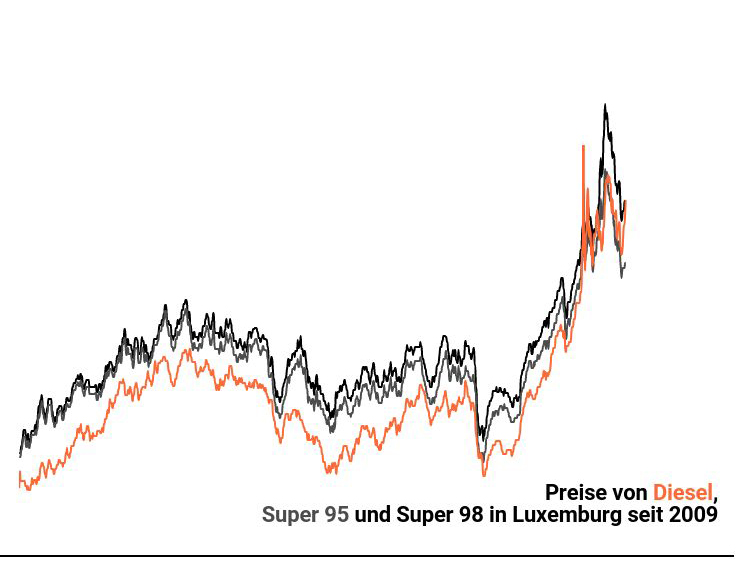 Seit Menschengedenken lag der Dieselpreis an den Luxemburger Tankstellen unter dem der Benzinsorten Super 95 und 98. Mit Kriegsbeginn Ende Februar riss er sich davon los. Innerhalb von nur sechs Tagen explodierte der Preis förmlich, am 10. März 2022 erreicht er seinen historischen Höchstwert: 2,112 Euro kostet der Liter des Selbstzündersprits an den Tankstellen im Land, ein Preis, der 14,9 Cent über dem von Super 98 liegt. Eine Woche vorher waren es noch mehr als 50 Cent weniger.