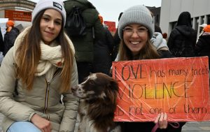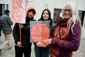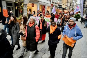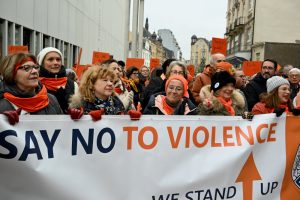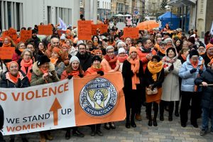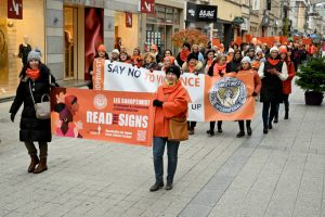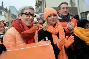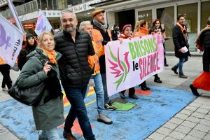 Jasmine Walisch und Jean-Luc De Matteis sind beide aus persönlichem Interesse beim Abschluss der „Orange Week“ an diesem kalten Samstag in Esch dabei, sagt Jasmine Walisch, „Jean-Luc aber auch für den OGBL“. Jasmine Walisch findet es „schade, dass wir noch hierherkommen müssen, dass es das noch gibt, aber das zeigt eben auch, wie wichtig es weiterhin ist, auf diese Missstände aufmerksam zu machen, über Gewalt gegen Frauen zu reden und eben nicht still zu bleiben“. Jean-Luc De Matteis, der OGBL Equality bei der Abschlusskundgebung vertritt, sagt zum Tageblatt: „Die ‚Orange Week‘ bietet den Menschen einen Rahmen, in dem sie sich ausdrücken können. Das Thema Gewalt wird zu oft noch unterdrückt, in den eigenen vier Wänden ertragen und dort gehalten. Hier und heute zeigen wir alle zusammen deutlich, wie es auch auf vielen Plakaten steht: Speak out! Redet darüber! Auch, damit Frauen den Mut haben, zur Polizei zu gehen. Gewaltopfer sollen durch die ‚Orange Week‘ sehen, dass es Unterstützung für sie gibt.“