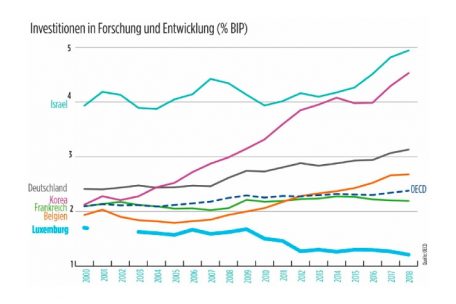 Die Ausgaben für Forschung und Entwicklung betrugen laut der OECD 2018 rund 1,2 Prozent des luxemburgischen Bruttoinlandproduktes. Das schließt sowohl die staatlichen wie die privaten Investitionen ein. Damit erreicht Luxemburg das von der EU angestrebte Drei-Prozent-Ziel nicht. Das Großherzogtum liegt damit auch hinter allen Nachbarländern und dem Durchschnitt der OECD-Mitgliedstaaten. Eine Erklärung ist der große Dienstleistungssektor in Luxemburg, der weit weniger forschungsintensiv ist als zum Beispiel die Autoindustrie. In der oben genannten Studie des FNR wünschten sich 48 Prozent der Befragten, der Staat solle mehr in die Forschung investieren.