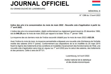 Egal, ob eine Tranche ausgezahlt werden muss oder nicht: Als nächster Schritt muss der neue Wert des „Indice base 100 = 1.1.1948“ im Amtsblatt veröffentlicht werden. Dazu sendet Statec eine entsprechende Mitteilung ans Wirtschaftsministerium, die die Meldung dann im „Journal officiel“ veröffentlicht. In dieser Meldung steht zudem der Wert des Sechsmonatsschnitts. Muss eine Tranche ausgezahlt werden, folgt ein weiterer Absatz, der den überschrittenen Schwellenwert sowie die neue „Cote d’application“ benennt. Diese „Cote d’application“ ist der Faktor, mit dem die Gehälter berechnet werden und die auf dem Gehaltszettel steht. Sie wächst bei jeder Indextranche um 2,5 Prozent. Seit der letzten Indexierung im April liegt sie bei 877,01 Punkten, davor lag sie bei 855,62. Wichtig: „Die neue ‚Cote d’application’ ist dann in Kraft, wenn sie im Memorial veröffentlicht wird“, erklärt Ferring. Also nicht beispielsweise erst am Monatsende, wenn die meisten Gehälter ausgezahlt werden.