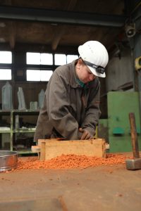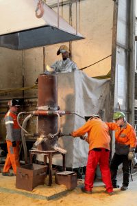 Moderne Technologien haben im FerroForum ganz bewusst Einzug erhalten. So wurde am Samstag beispielsweise nach historischen Plänen eine alte Gussform im 3D-Drucker nachgebildet, die dann später wieder nachgegossen werden kann. Die Abläufe der Eisenherstellung und der nachträglichen Verarbeitung sollen chronologisch dargestellt werden. Start ist die Eisenherstellung, wo in einem kleinen Hochofen demnächst Eisen auf Basis von Eisenerz hergestellt wird. Am Samstag wurde der Kuppelofen („Cubilot“) in Betrieb genommen, der mit Schrott befüllt wurde. Die zum Anheizen benötigte Anthrazit-Kohle und der Koks stammen aus Altbeständen – fast 10 Tonnen-, die Guy van Hulle der Vereinigung gestiftet hat.