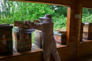Die jungen Besucher machen große Augen. Hinter einer Glasscheibe stehend, beobachten sie den Imker, der sich, im Schutzanzug, am Bienenstock zu schaffen macht. Es ist Freitagmorgen auf dem Matgesfeld in Beles.
