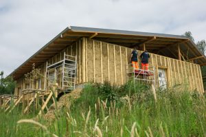 2021 wurde auf dem Matgesfeld mit dem Bau eines Umwelt- und Bildungszentrums begonnen, dank kräftiger Unterstützung des lokalen CIGL („Centre d’initiative et de gestion local“). Was wie ein einziges großes Haus aussieht, sind ausgemusterte Baustellencontainer, die miteinander verbunden wurden. Eine Dachkonstruktion aus Holz schützt vor Sonne und Hitze, genau wie die Fassadenisolierung aus komprimiertem Stroh, Lehm und Holz. „Alle Materialien, die wir hier benutzen, können später wieder entfernt und weiterverwendet werden“, so Christophe Mossong. Kreislaufwirtschaft nennt sich das, oder bewusst schonender Umgang mit Natur und Rohstoffen. Das Projekt Matgesfeld ist von A bis Z gelebte Umweltverträglichkeit.