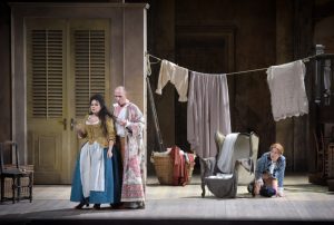 Dort spielte dann auch Rhorers Ensemble Le Cercle de l’Harmonie, was ja ein auf historischen Instrumenten spielendes Orchester ist. Da machte es dann auch Sinn, dass Gray auf eine zeitgerechte Inszenierung setzte mit Bildern, Kostümen und Bewegungen aus Mozarts Zeit. Gray hatte zusammen mit seinem Bühnenbildner Santo Loquasto ein stimmungsvolles Bühnenbild geschaffen, das schnell und flexibel für jeden Akt geändert werden konnte. Hatte man sich erst einmal an diese zeitbezogene und „altmodische“ Inszenierung gewöhnt, konnte man dann auch schnell hinter die Charaktere der verschiedenen Personen blicken. Diese hatte Gray vorzüglich und authentisch gezeichnet.