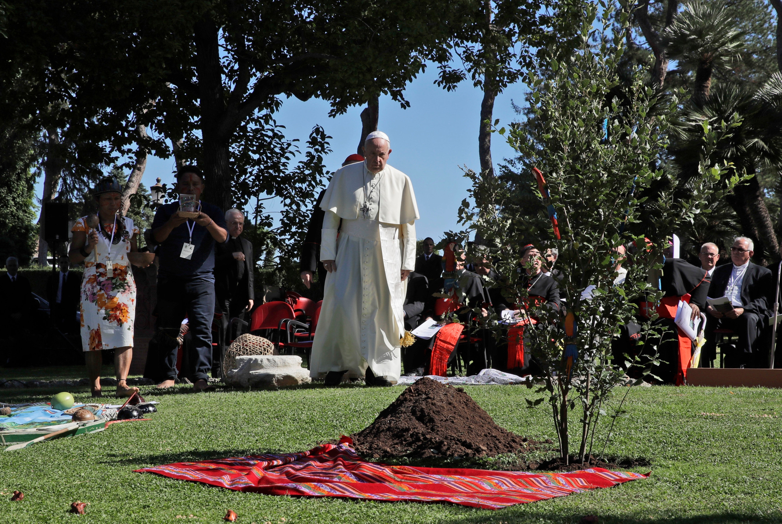 Papst Franziskus steht während einer Baumpflanzzeremonie anlässlich des Festes des Heiligen Franziskus von Assisi, des Schutzpatrons der Ökologie, vor einer neu gepflanzten Eiche.