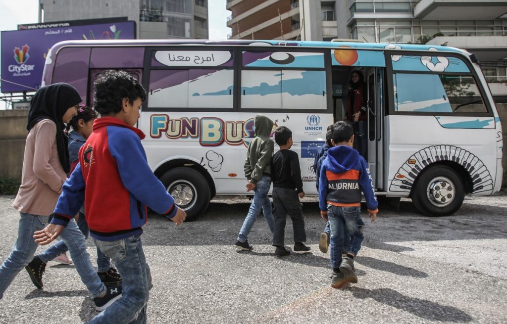 Im noblen Geschäftsviertel Raouché der libanesischen Hauptstadt Beirut freut sich eine kleine Gruppe syrischer Flüchtlingskinder auf einen blau-weiß-lila Bus. Eigentlich verkaufen die sieben Kinder im Alter von sechs bis fünfzehn Jahren hier in der Stadt Taschentücher, CDs, Blumen und Kaugummi, um ihre Familien finanziell zu unterstützen. Manche betteln auch. Aber in dem «Fun Bus» (Spaßbus) können sie für ein paar Stunden Pause machen und unter der Anleitung zweier Sozialarbeiterinnen mit anderen Kindern in ihrem Alter lernen, malen, singen und spielen. Gefördert wird das Projekt von der Flüchtlingsorganisation der Vereinten Nationen (UNHCR) und der Europäischen Union.