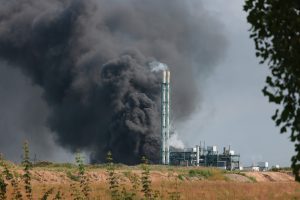 Einsatzfahrzeuge der Feuerwehr, Rettungsdienste und Polizei stehen unweit einer Zufahrt zum Chempark über dem eine dunkle Rauchwolke aufsteigt.  Foto: Oliver Berg/dpa