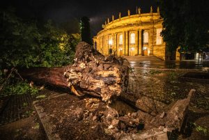 An der Stuttgarter Staatsoper wurden Teile der Dachverkleidung abgedeckt. Zudem stürzten Statuen von ihrem Sockel. „Ich stehe unter dem Dach und werde ganz schön nass“, sagte der Intendant Viktor Schoner der dpa am Montagabend. Die Seitenbühne habe unter Wasser gestanden – teils sei der Regen über die Lampen ins Gebäude geflossen. 250 Gäste seien zur Zeit des Unwetters bei einem Liederabend in der Oper gewesen, niemand sei verletzt worden.