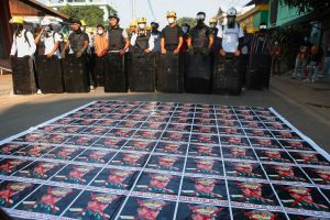 Demonstranten in Schutzkleidung stellen sich der Polizei auf einer Straße mit Bildern des Chefs der myanmarischen Streitkräfte, Senior General Min Aung Hlaing, während einer Demonstration gegen den Militärputsch in Naypyidaw am 4. März 2021