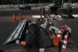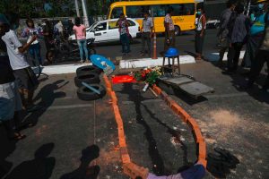 Eine kleine Barrikade wird um Blutflecken auf einer Straße in Yangon errichtet