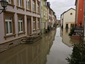 Vor zehn Jahren hat er das Haus in der rue St-Willibrord gekauft. Der Portugiese stammt aus Vale de Cambra, südlich von Porto, im Landesinneren gelegen. Da ist das Moseltal schon etwas anderes. Zum zweiten Mal macht er mittlerweile ein Hochwasser mit. Sein Keller steht voller Wasser. «Un peu partout», sagt er zur Wasserlage. Er ist am pumpen. Am Sonntagabend gegen 22.00 Uhr hat er begonnen, eine Stunde ging das. «Seit sechs Uhr heute Morgen fällt der Pegel», sagt er. Jetzt gilt es.