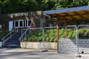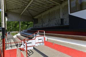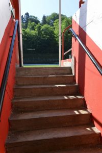 «Der damalige Kapitän Michel Mosinger hat um 1920 in England studiert. Die Haupttribüne und das Eingangsportal wurden deshalb nach englischem Vorbild geplant und errichtet», erklärte Erny Muller gegenüber dem Tageblatt. Die Haupttribüne wurde aus Holz und Metallträgern gebaut. Sie ist in den Farben Rot, Weiß und Schwarz gehalten.