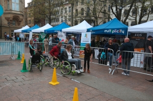 Das Thema Handicap hat viele Gesichter, eigentlich so viele, dass sich gesunde Menschen kaum all die Hürden vorstellen können, mit denen es Personen mit spezifischen Bedürfnissen im Alltag zu tun haben. Bereits eine nur wenige Zentimeter hohe Bordsteinkante stellt für Rollstuhlfahrer ein beachtliches Hindernis dar. Um sich besser in diese Situation hineinzuversetzen, konnten sich am Samstag Erwachsene und Kinder im Rollstuhlfahren versuchen. So manch einer hatte dann auch viel Mühe, auf dem Rollstuhlparcours die auf den ersten Blick geringen Hürden zu überwinden.