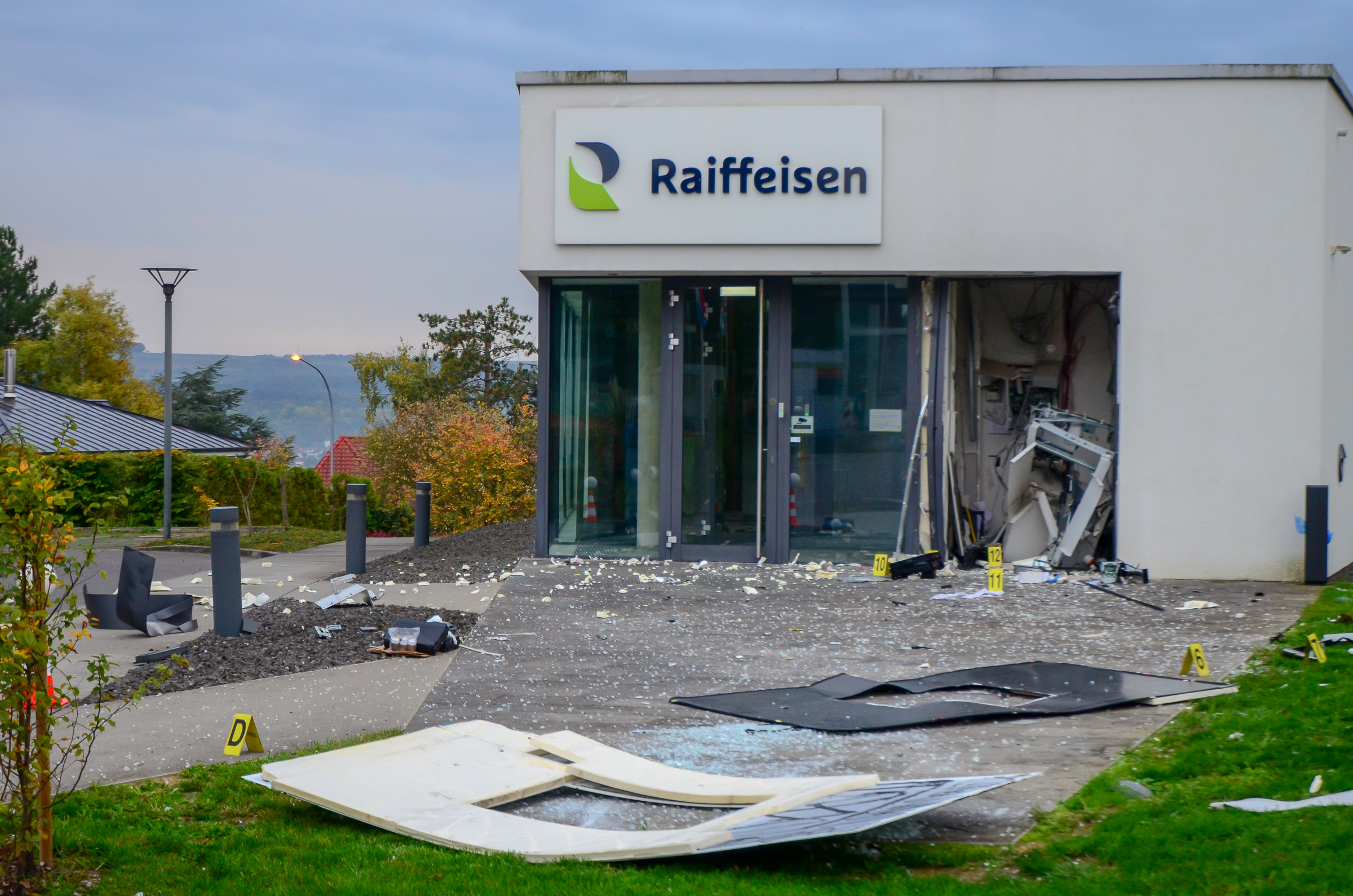 Unbekannte haben in der Nacht von Montag auf Dienstag einen Geldautomaten der Bank Raiffeisen im Remicher Gewerbegebiet «Jongebësch» gesprengt. Der Geldautomat war an der Fassade des Gebäudes angebracht. Durch die Explosion wurde der Automat aus der Verankerung in der Mauer gerissen. Der Eingangsbereich des Gebäudes wurde durch die Explosion ebenfalls stark beschädigt. Die Staatsanwaltschaft hat die Kriminalpolizei mit den Ermittlungen beauftragt.