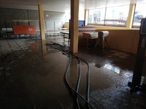 Gegen Ende des Besuchs bei der CIGR-Truppe in der Gruusswiss rät Roger Wirtz unserem Tageblatt-Journalisten, nach Echternach zu fahren. Dort würde derzeit eine andere Arbeitergruppe das öffentliche Schwimmbad säubern. Der stärker werdende Regen und der graue Himmel kündigen den schaurigen Anblick der Echternacher Sporthalle und des Schwimmbades wahrlich an. Auch jetzt, zwei Wochen nach den Überschwemmungen, findet man an einigen Stellen der Eingangshalle der Sporthalle noch Wasserpfützen. Und Schlamm: Im Eingangsbereich, am Boden, an den Wänden, sogar an den Geländern. In einem Raum in der untersten Etage des Gebäudes steht sogar jetzt noch Wasser – ungefähr knietief. Einer der CIGR-Arbeiter rechnet damit, dass die Arbeiten an der Echternacher Sporthalle die ganze Woche andauern werden.