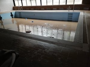Nicht weit vom Eingangsbereich der Sporthalle entfernt unterhalten sich zwei Bademeisterinnen. Auf Nachfrage gewähren sie Einlass in das nun braune Echternacher Schwimmbad. Die beiden gehen zum Hintereingang des Gebäudes, steigen einige Treppen hinunter und springen über eine große Wasserpfütze ins Innere des Schwimmbads. Der Anblick des öffentlichen Bades gleicht jenem der Turnhalle: wieder überall braune Schlammmassen. Beim kleineren Becken habe man das Wasser schon abgelassen, erklärt eine der Bademeisterinnen. Das große Becken hingegen ist noch bis zum Rand mit braunem Wasser gefüllt. Es ist jedoch nicht nur der ungewohnte Anblick, der verstörend wirkt: Auch der Geruch ist fremd. Von Schwimmbädern erwartet man den üblichen strengen Chlorgeruch – von diesem fehlt jede Spur. Stattdessen ein übelriechender, fauliger Gestank.