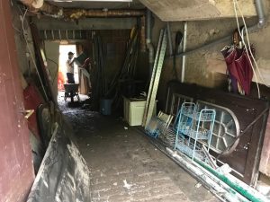 Derzeit arbeiten drei Teams – insgesamt neun Personen – an dem Haus in Bollendorferbrück. Und die scheinen auch nötig zu sein: Das Sprichwort „Ein Bild sagt mehr als tausend Worte“ scheint in diesem Augenblick äußerst passend. Die wahrscheinlich knapp zwei Meter breite Garage des Hauses ist gleichzeitig auch ein Durchgang zu dem nahe am Fluss gelegenen Garten. Der Garagenboden hat eine deutliche Neigung. Ein kleiner Pfad durch die Garage wurde mit dünnen Holzplatten ausgelegt. Grund: Der restliche Boden ist noch komplett mit dem feuchten Schlamm des Flusses bedeckt – und spiegelglatt.